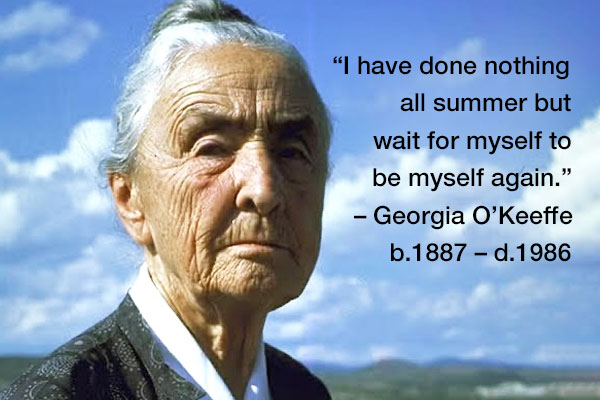 Quote of the Week – Georgia O’KeeffeBooks, Memoirs, Films, and Mediaquote of the weekSept 09 2025 “I have done nothing all summer but wait for myself to be myself again.” – Georgia O’Keeffe, b.1887 – d.1986 Promote Your Book or Facility Here